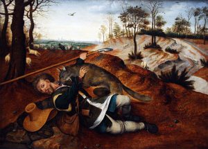 <>Hooft vertelt er van in zijn “Nederlandse Historiën”, dat gedurende de opstand tegen Spanje “heele dorpen verlaaten werden en naardat de mensen minderden ’t ongedierte aanfokte, toen in de huizen de wolven quaamen nestelen en men vernam hunne jongen geworpen in de bedsteden; toen deze gruwelijke beesten derwijze vermenighvuldigden in Brabant en Vlaandre, dat zij bij schaarsheit van aas, niet alleenlijk het vee, maar wyven en mannen aanranzden; de kinderen uit de wiegh oft der ouderen armen schaakten, en op een jaar (zoo bereekent werd) omtrent Gent, binnen twee mijlen in ’t ronde, wel honderd menschen verslonden”..<einde citaat.